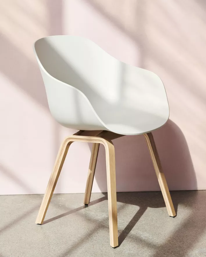 De stoel heeft een breedte van 59 centimeter, een diepte van 54 centimeter en een hoogte van 82 centimeter. De stoel heeft een zithoogte van 46,5 centimeter en een zitdiepte van 42 centimeter. De stoel heeft een vierpotig onderstel van gevormd en gebogen multiplex met een binnenkant van beukenfineer en een top van eiken-of walnootfineer. De poten zijn voorzien van plastic vloerbeschermers die op aanvraag ook verkrijgbaar zijn in een vilten variant. De zitkuip van de stoel is gemaakt van gespoten en gegoten, gerecycled plastic en is voorzien van armleuningen. De About a Chair AAC222 stoel van Hay is in verschillende varianten verkrijgbaar. Neem voor meer informatie contact met ons op.