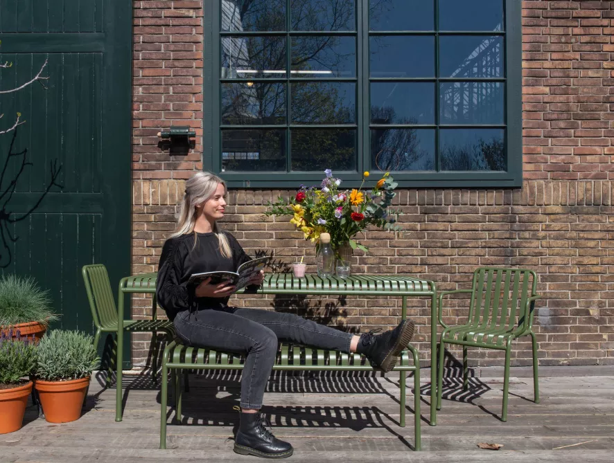 De Palissade eetbank van Hay is gemaakt van elektro-gegalvaniseerd staal met een poedercoat en verkrijgbaar in 4 varianten: gegalvaniseerd staal, olijfgroen, lichtgrijs en antraciet. De bank heeft een breedte van 120 centimeter, een diepte van 42 centimeter en een hoogte van 45 centimeter.