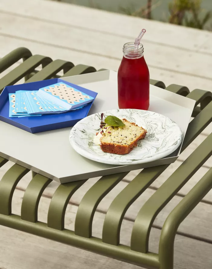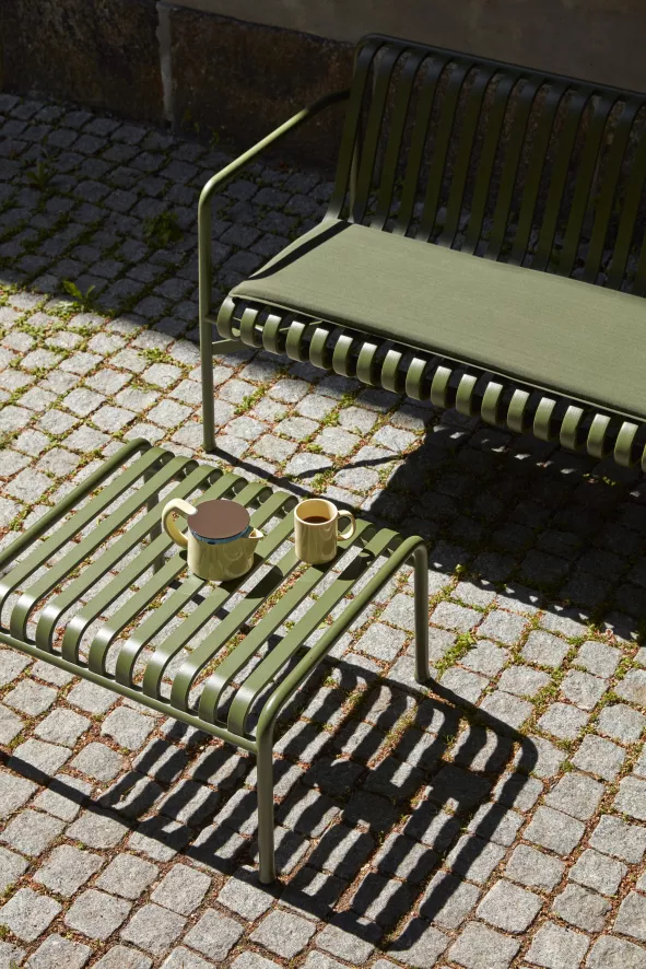 De Palissade voetenbank van Hay is gemaakt van elektro-gegalvaniseerd staal met een poedercoat en verkrijgbaar in 4 varianten: gegalvaniseerd staal, olijfgroen, lichtgrijs en antraciet. De voetenbank heeft een breedte van 65 centimeter, een diepte van 60 centimeter en een hoogte van 37 centimeter.